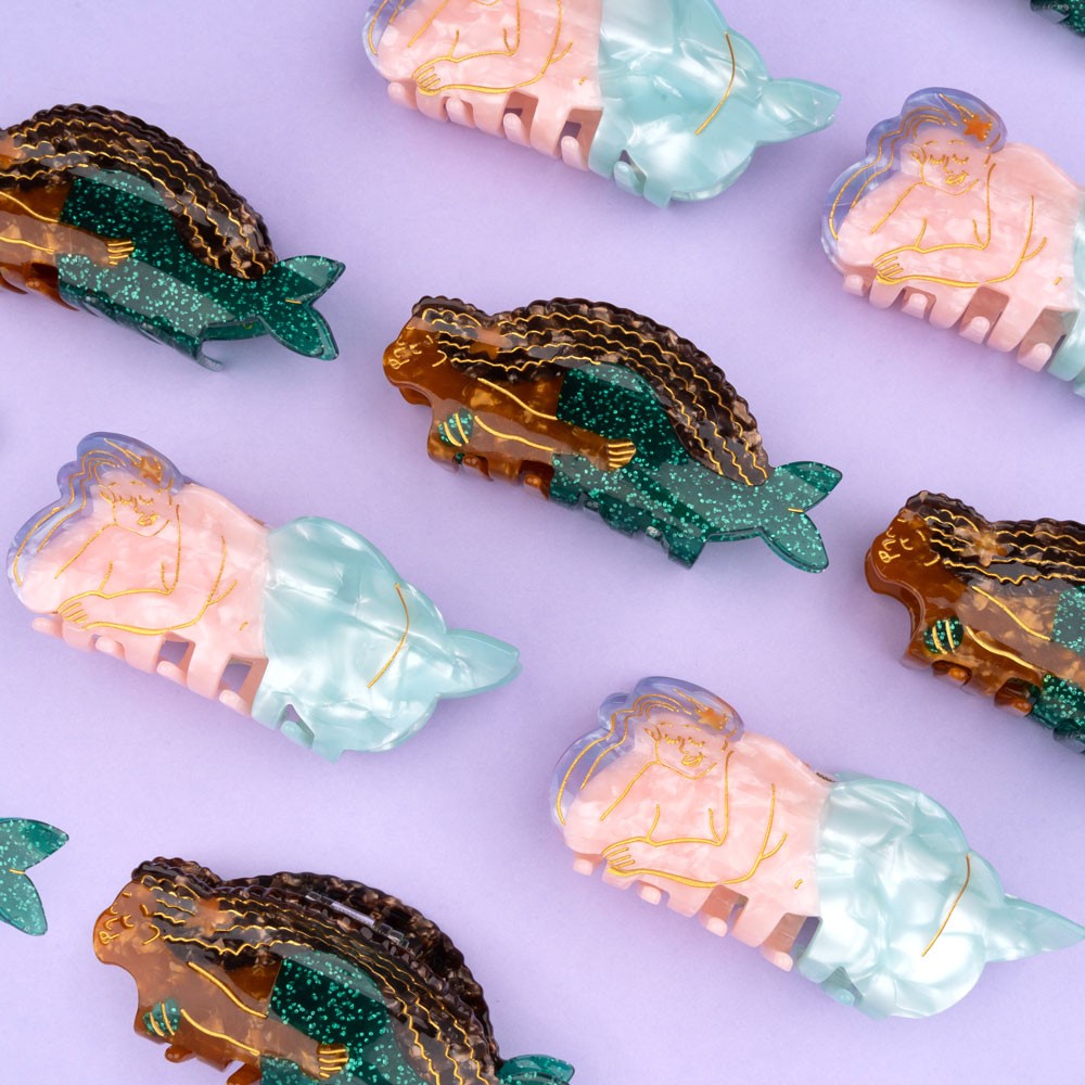 A creative hair claw shaped as a cute mermaid posing like a pin-up of the ocean! She’s charming everyone in the sea and on earth with her iridescent purple hair and her turquoise blue fish tail…